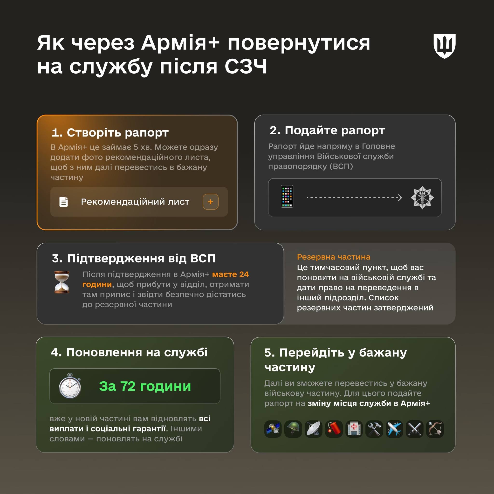 «Є моменти, про які я хотіла би поговорити конкретніше. Наприклад, прибуття до відділу ВСП за 24 години. Як дізнатися, коли розпочнеться відлік часу? Армія+ надішле сповіщення одразу після того, як Головне управління ВСП перевірить та підтвердить дані військового в рапорті. Ба більше, застосунок запропонує вам обрати відділ для звернення. Саме там оформлять документи та допоможуть безпечно дістатися до резервної військової частини», – наголосила вона.