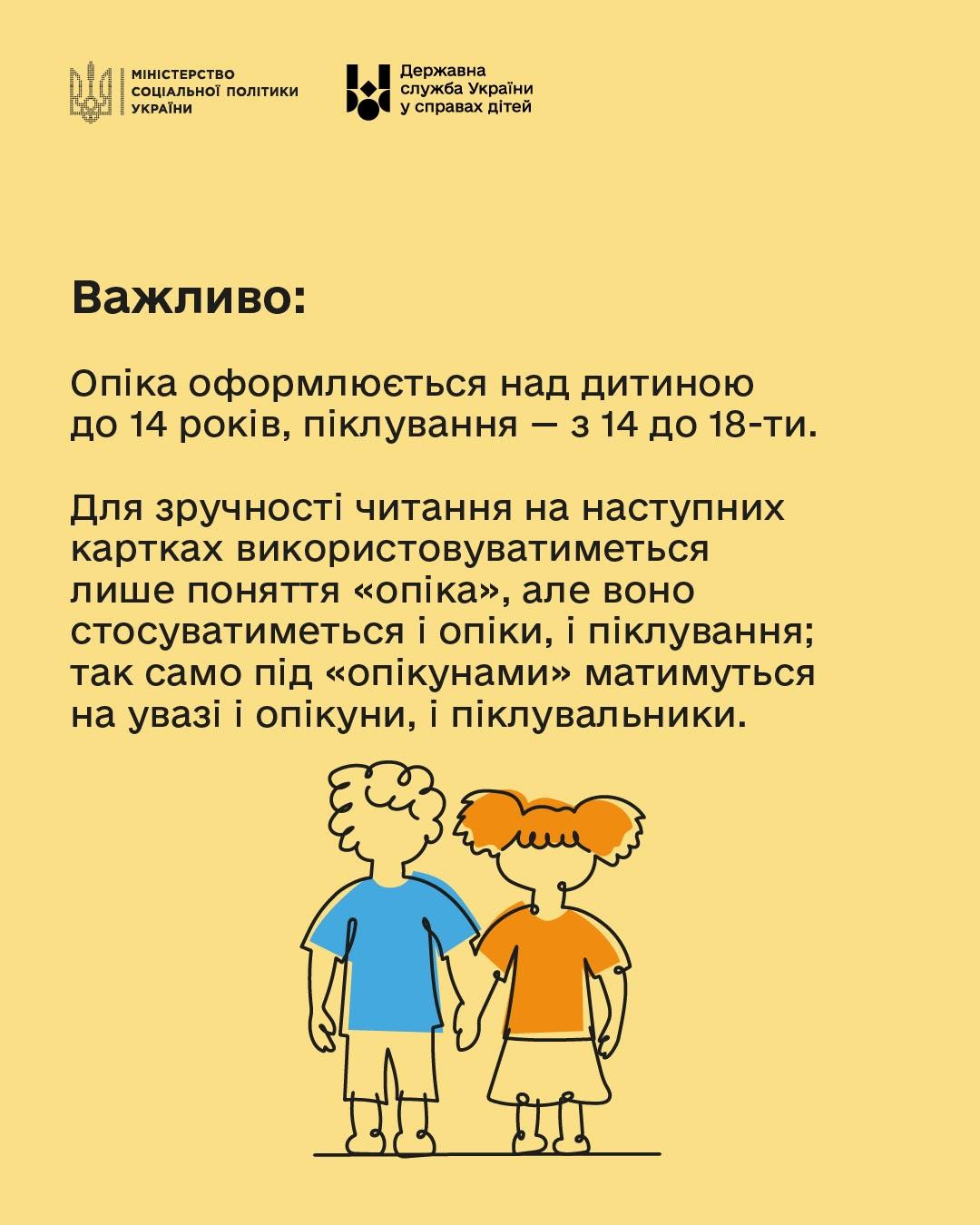Важливо: для зручності читання на картках використовується лише поняття «опіка», але воно стосується і опіки, і піклування; так само під «опікунами» маються на увазі і опікуни, і піклувальники.