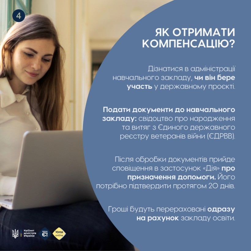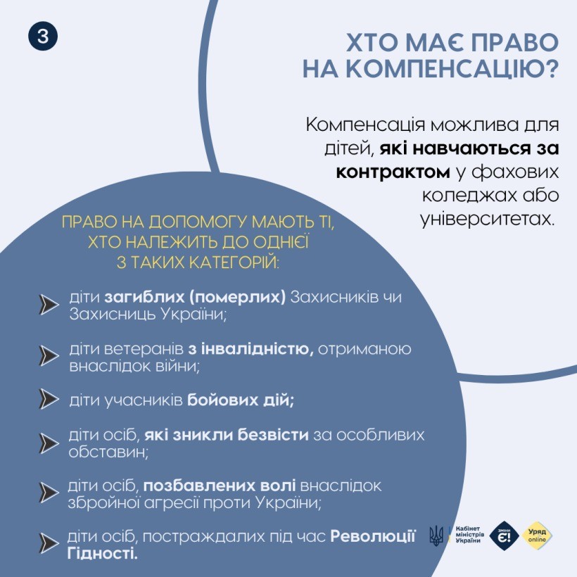 Компенсація можлива для дітей, які навчаються за контрактом у фахових коледжах або університетах.