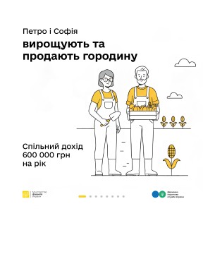 Отже: подружжя Петро та Софія взяли в оренду кілька теплиць. На площі у 0,5 га вони вирощують зелень, овочі та ягоди, які потім продають на ринку та через соціальні мережі. Річний дохід пари – 600 тис. гривень.