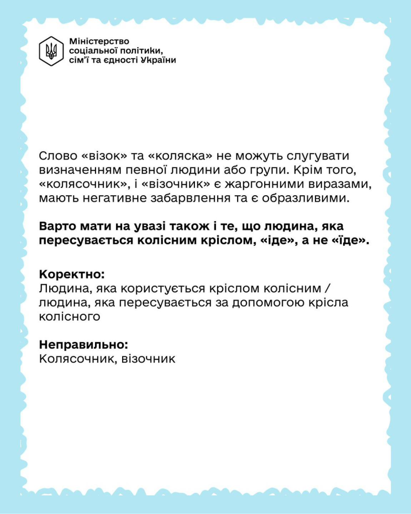 Сьогодні в межах рубрики «Словник безбар’єрності» Міністерство соціальної політики, сім’ї та єдності пояснює, як коректно називати людину, яка користується кріслом колісним.