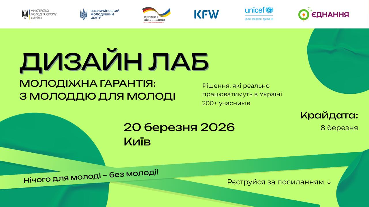 Дизайн-лаб «Молодіжна гарантія: з молоддю для молоді» – це простір, де молоді люди разом із представниками держави та експертами створюють рішення для працевлаштування, освіти та професійного розвитку молоді. Зустріч є частиною комплексу заходів, спрямованих на формування ефективної реалізації ініціативи Європейського Союзу «Молодіжна гарантія» в Україні.