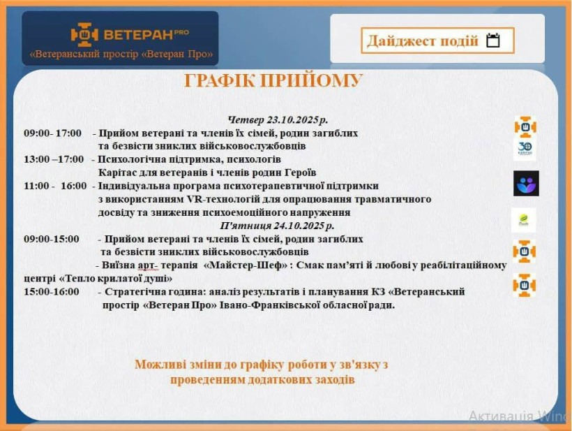 Графік роботи Ветеранського простору «Ветеран Про» на тиждень з 20 по 24 жовтня 2025 року