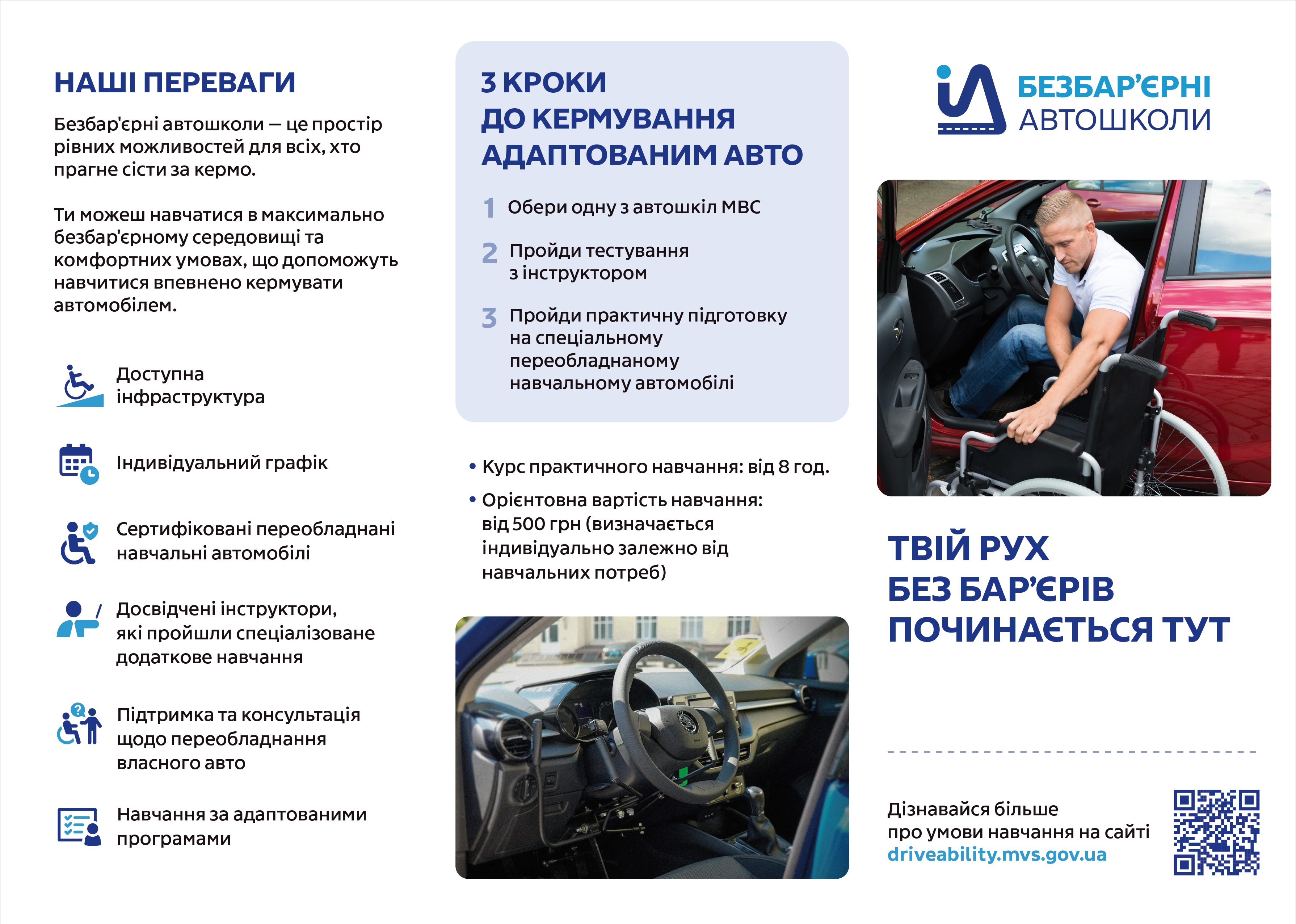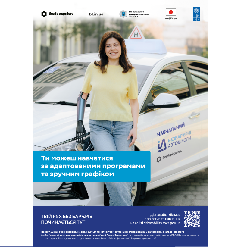 Міністерство внутрішніх справ України з 2024 року реалізує проєкт «Безбар’єрні автошколи» — платформу можливостей для осіб з інвалідністю, які прагнуть опанувати навички керування транспортними засобами. Ініціатива впроваджується в межах національного проєкту Першої леді України Олени Зеленської «Без бар’єрів».