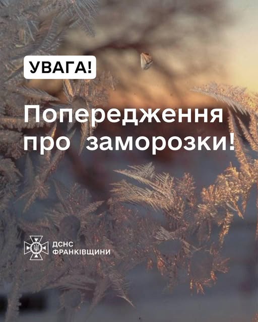 Метеопопередження Головна Надвірнянська РДА Увага Вночі та вранці 08 травня на поверхні ґрунту заморозки 0 -5° (I рівень небезпечності, жовтий).