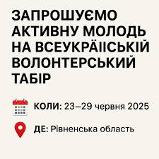 З метою посилення компетентностей молоді у сфері волонтерської діяльності, популяризації ідей та цінностей волонтерства як ключового ресурсу для вирішення соціальних проблем, а також зміцнення громадянської активності, з 23 по 29 червня 2025 року в Рівненській області пройде Всеукраїнський табір для молоді.