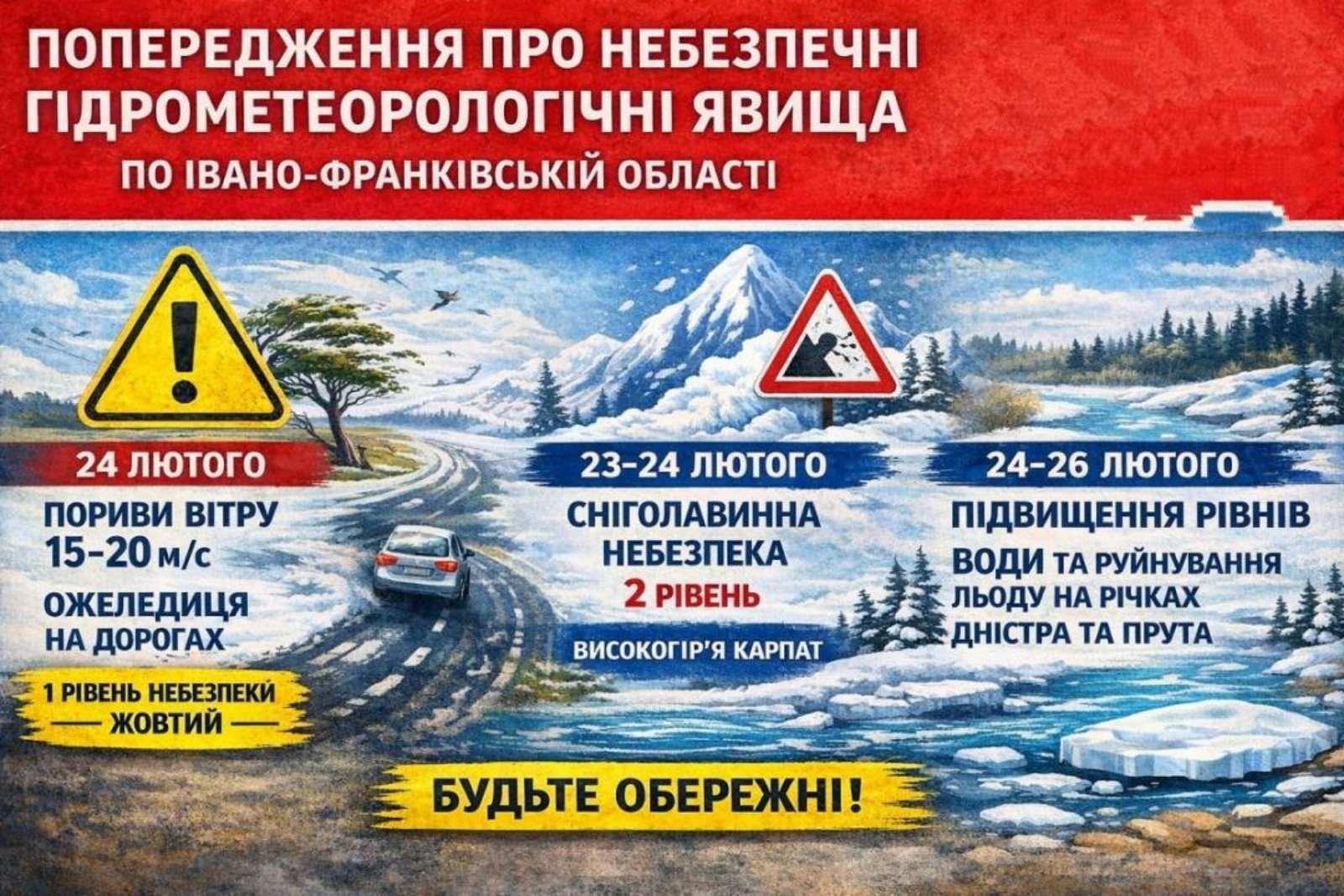 23-24 лютого у високогір’ї Івано-Франківської області та високогір’ї східної частини Закарпатської області очікується помірна сніголавинна небезпека (2 рівень).