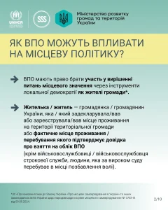 Міністерством розвитку громад та територій України на виконання заходу 5 завдання 3 Плану заходів з реалізації у 2025-2026 роках Національної стратегії сприяння розвитку громадянського суспільства в Україні на 2021-2026 роки, затвердженого розпорядженням Кабінету Міністрів України від 21 березня 2025 р. № 246-р, опрацьовано питання залучення внутрішньо переміщених осіб до вирішення питань місцевого значення