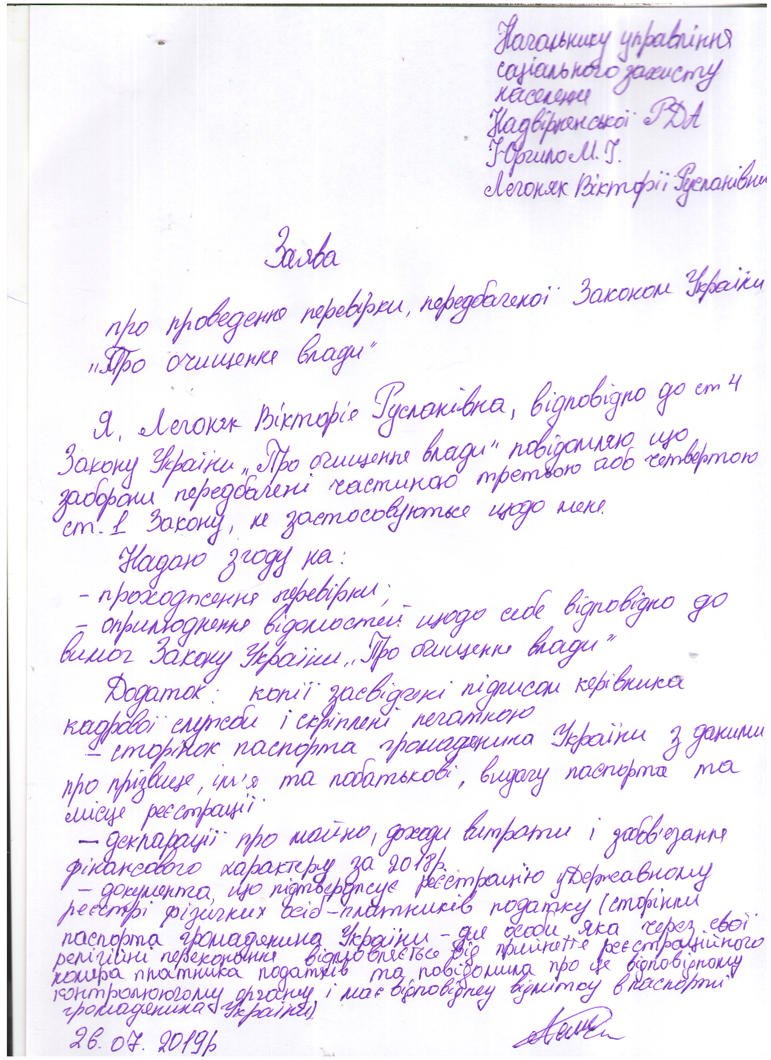 Заява про прведення перевірки, передбаченої Законом України "Про очищення влади" Лозяк Мар'яна Василівна